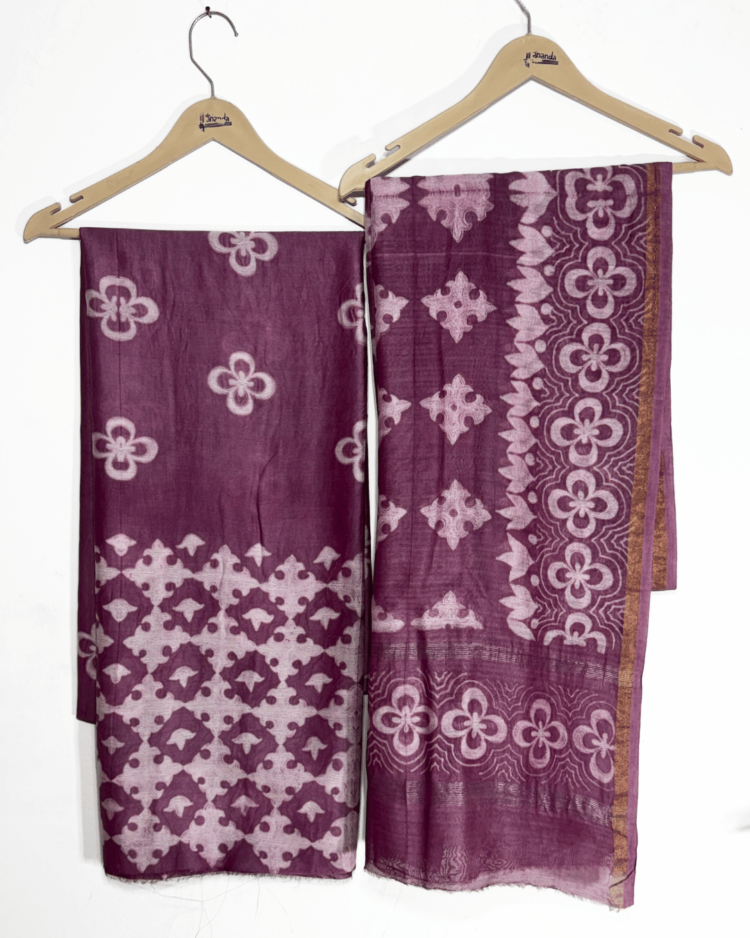 Graceful and timeless, this Chanderi Silk shirt fabric and dupatta set in a rich purple hue beautifully captures the essence of handcrafted elegance. The natural sheen of Chanderi silk lends the ensemble a luxurious touch, while its lightweight texture ensures effortless comfort and fluid drape.