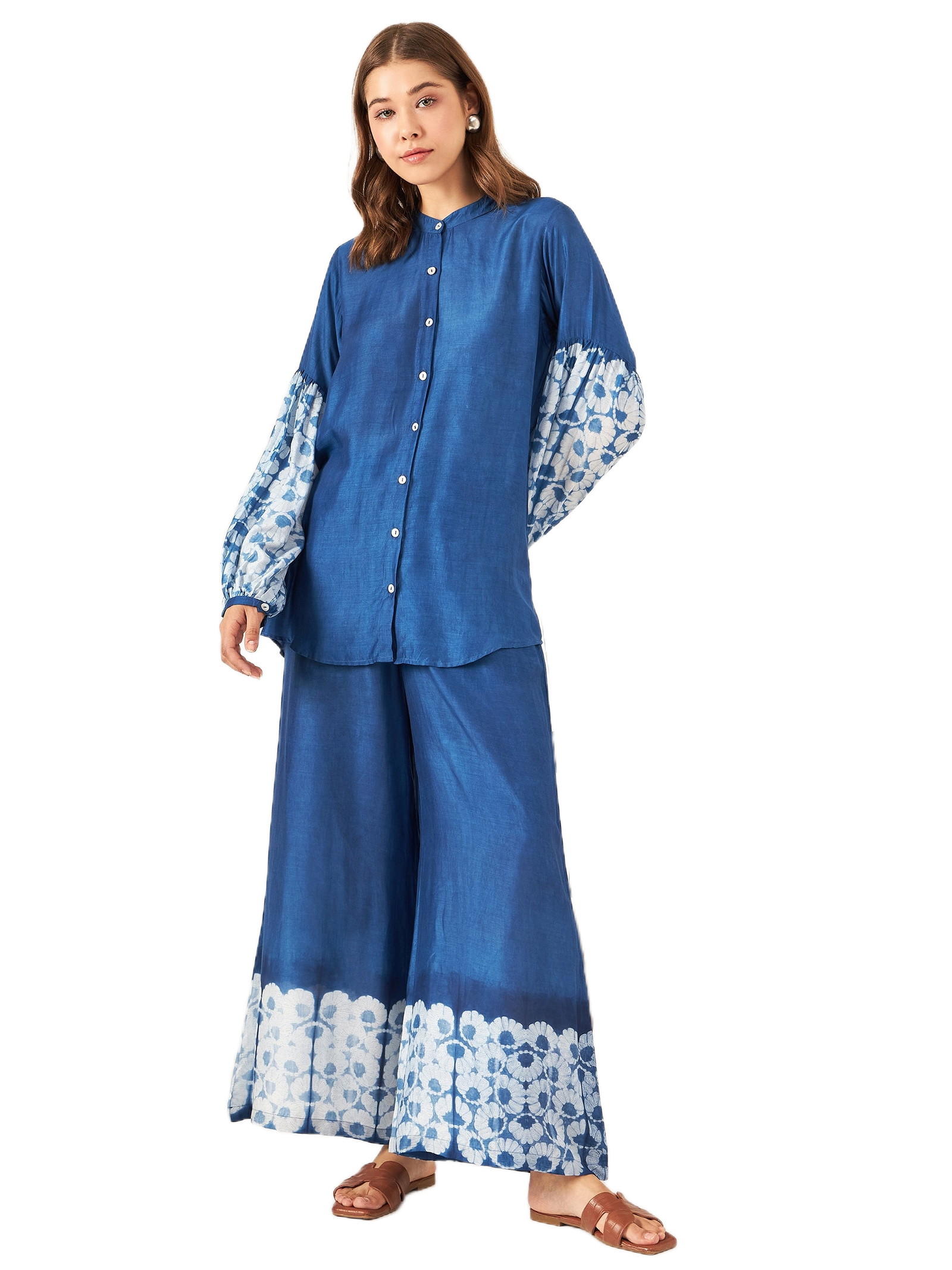 Perfectly paired with matching palazzo pants, this ensemble blends tradition with contemporary flair. This Palazzo Pant, crafted from a soft blend of plant-based silk and cupro cotton, is designed for both style and ease. Their relaxed, flowing silhouette moves gracefully with every step, offering all-day comfort without compromising elegance.