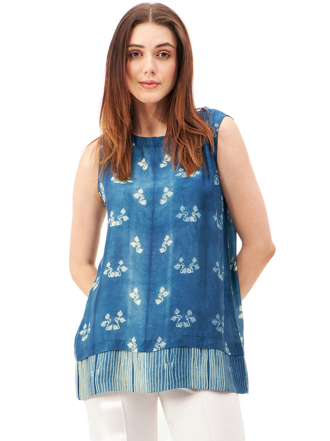 Sleeveless Shibori Top with Striped Border.This breezy, handcrafted in traditional Shibori dye technique, featuring a beautifully detailed striped border that adds a touch of sophistication. Made from a soft, breathable blend of plant-based silk and cupro cotton, it drapes effortlessly for all-day comfort.