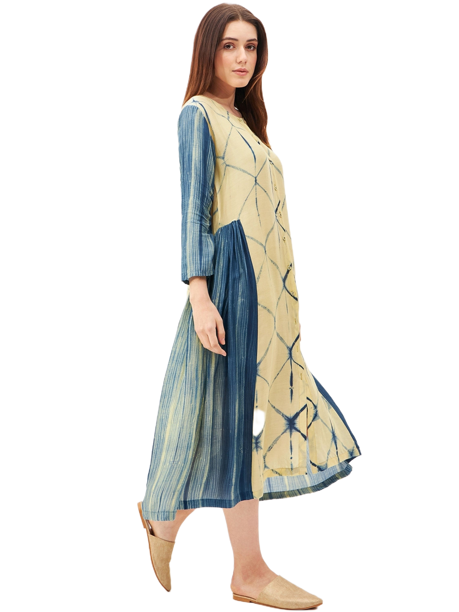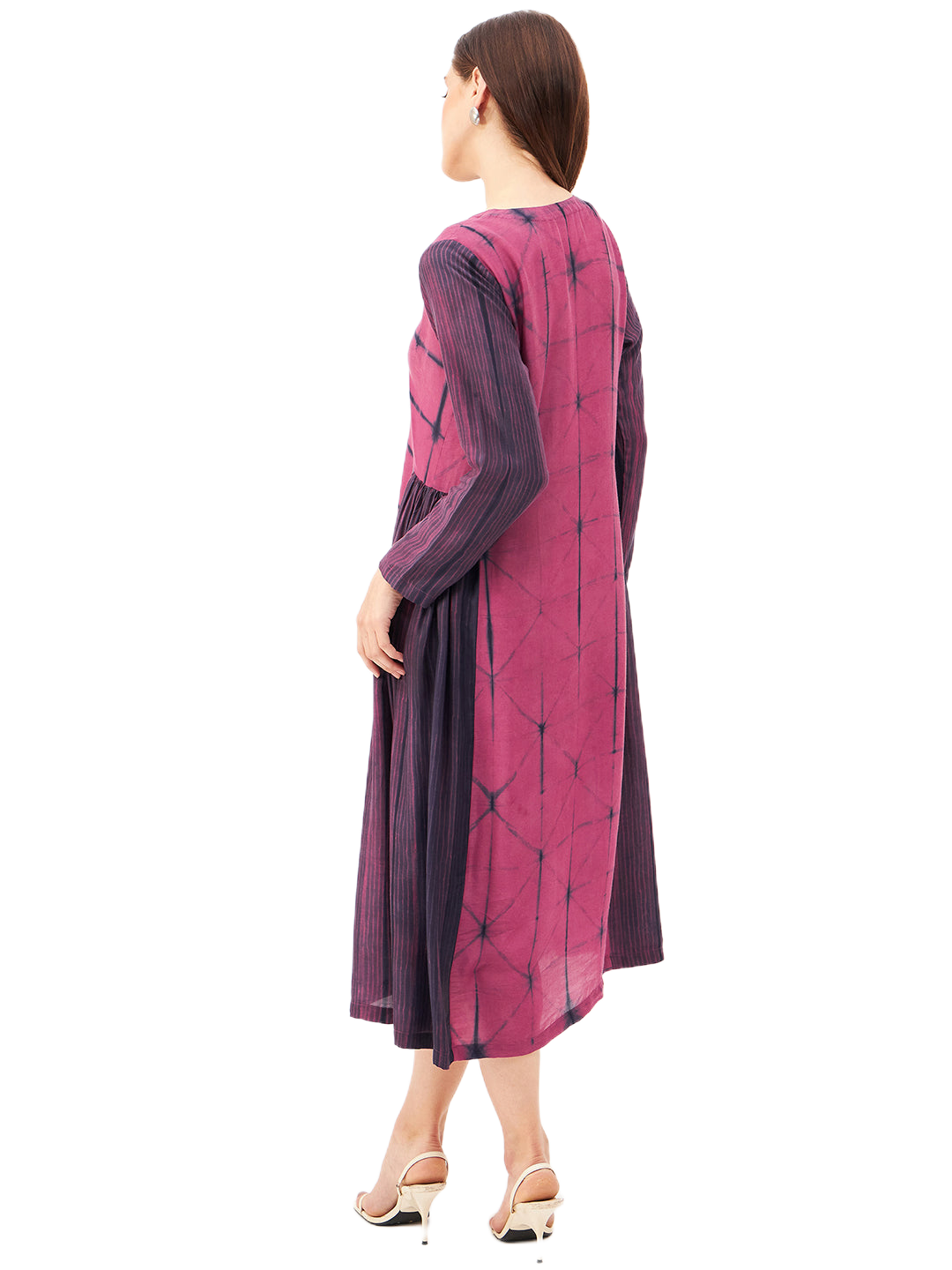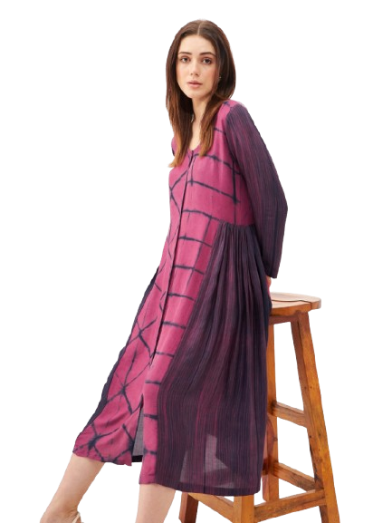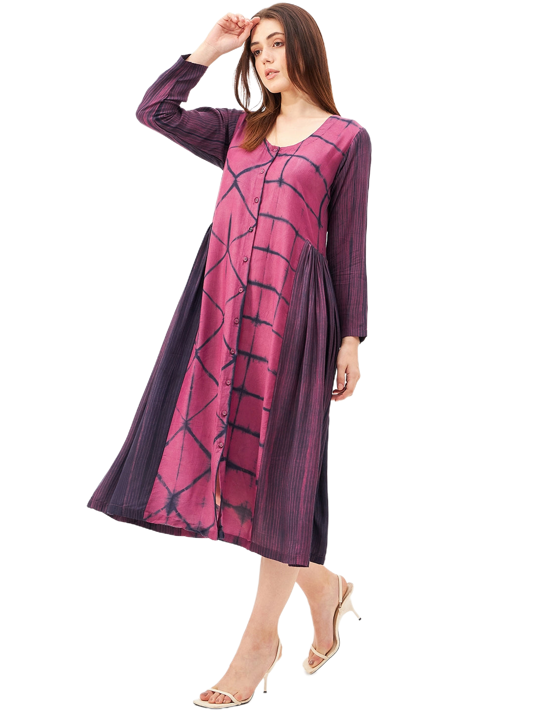 Elevate your wardrobe with this elegant dress, crafted from a luxurious blend of plant-based silk and cupro cotton. Designed in a rich purple indigo hue, it features a flattering side-gather detail and a classic round neckline. The front opening adds a touch of ease and versatility, while the full-length sleeves offer a graceful silhouette. Perfect for both casual and semi-formal occasions, this dress blends comfort with sustainable sophistication.
