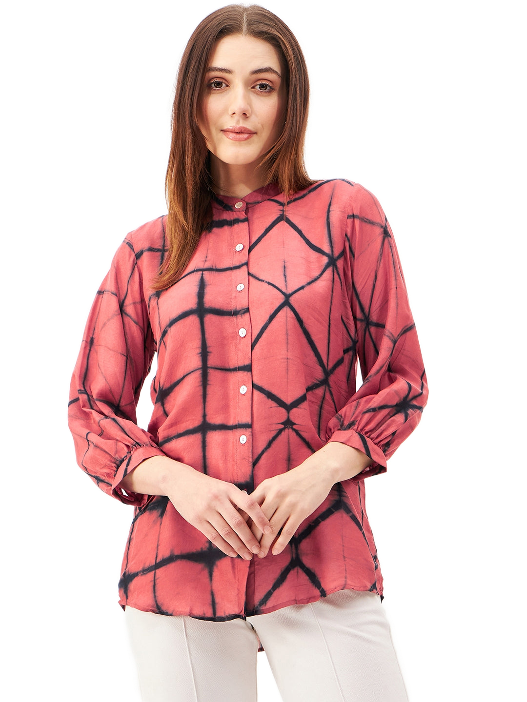 Loose Fit Shibori Shirt Elevate your wardrobe with this handcrafted shirt featuring a loose fit and a classic button-down front. Designed with a Chinese collar and 3/4 sleeves, it blends tradition with a contemporary silhouette. Made from a sustainable blend of plantbased silk and cupro cotton, the fabric is breathable and soft against the skin. Each piece is uniquely hand-dyed using the ancient Shibori technique, ensuring no two shirts are exactly alike.