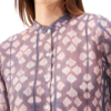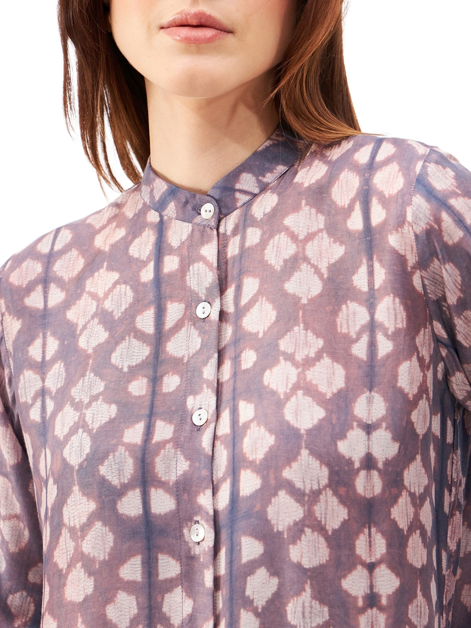 A plant-based silk and cupro cotton long kaftan-look top with a V-neckline, featuring two handcrafted shibori designs at the bodice and skirt. The V-neck adds a touch of elegance and elongates the neckline, balancing the relaxed flow of the silhouette.