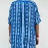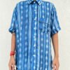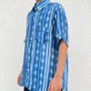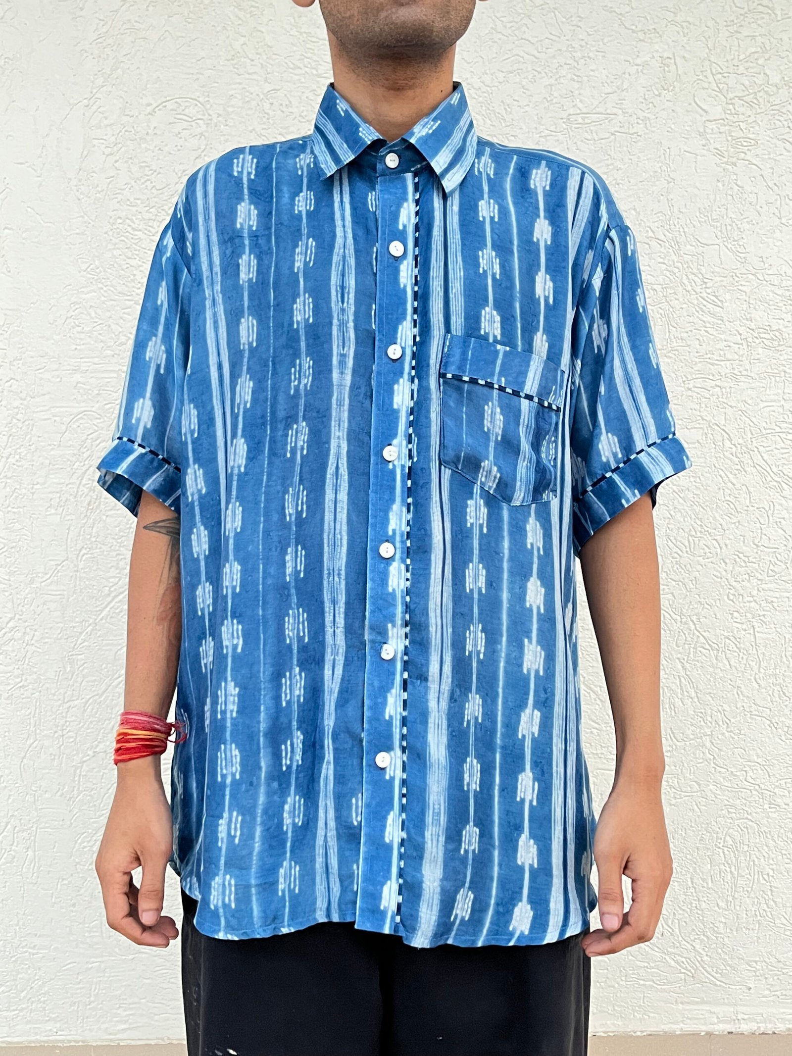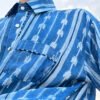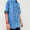 The main body features a shibori pattern, while the placket, sleeves, and pocket are finished with a different shibori technique,