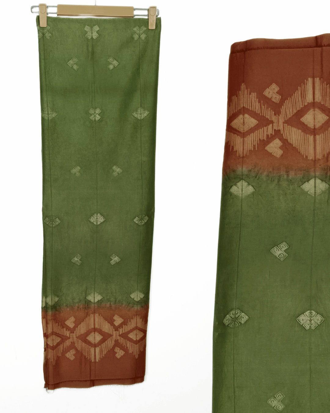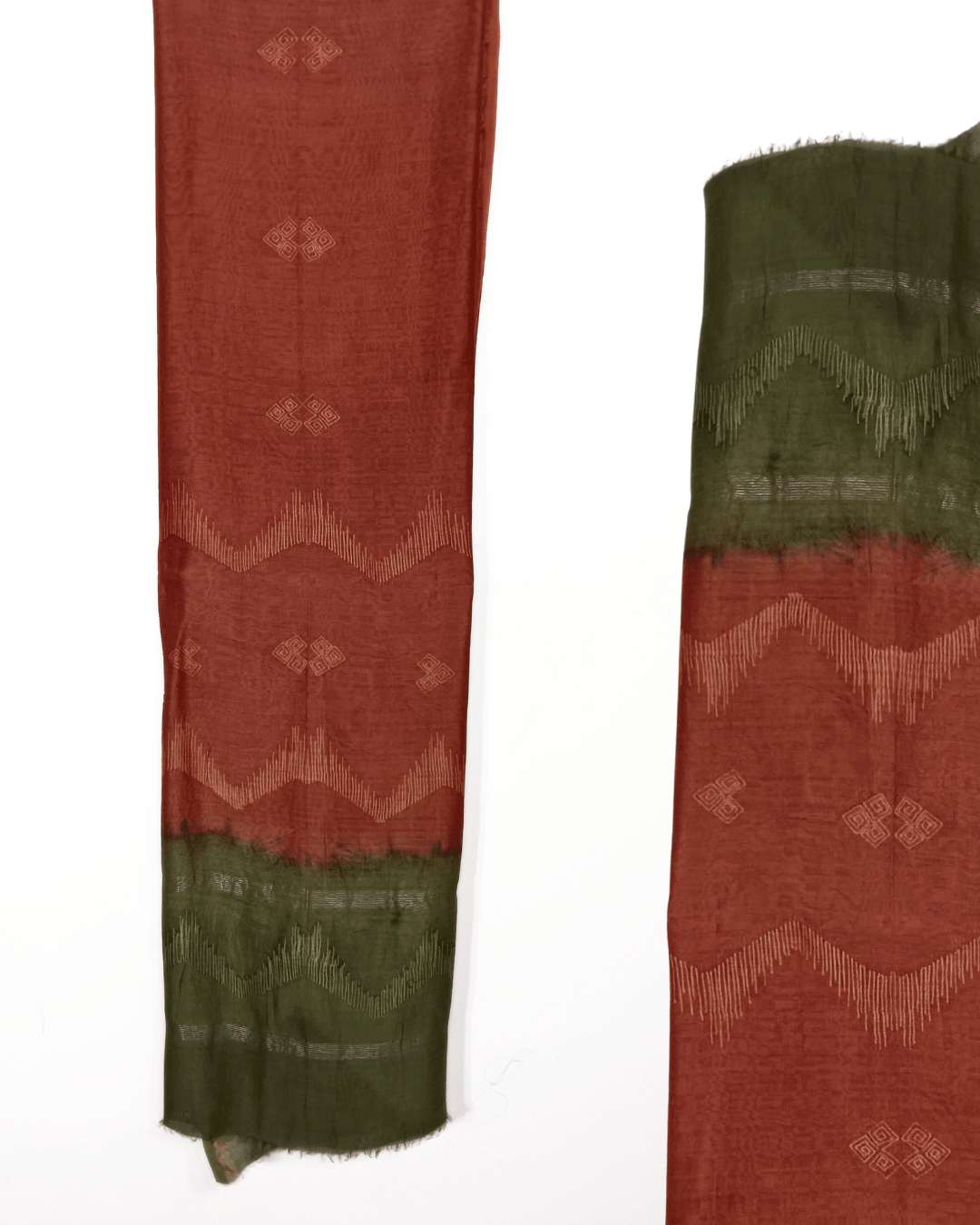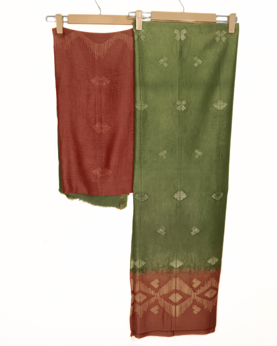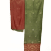 Rust and Green Contrast Moonga Silk Shirt Fabric and Chanderi Dupatta dyed with vegitable colour. An elegant expression of handcrafted artistry, this set pairs a luxurious Moonga silk shirt fabric in rich rust and green tones with a Chanderi dupatta adorned in intricate Shibori dyeing. The natural sheen of Moonga silk enhances the vibrant contrast, while the lightweight Chanderi dupatta adds a graceful, translucent charm.