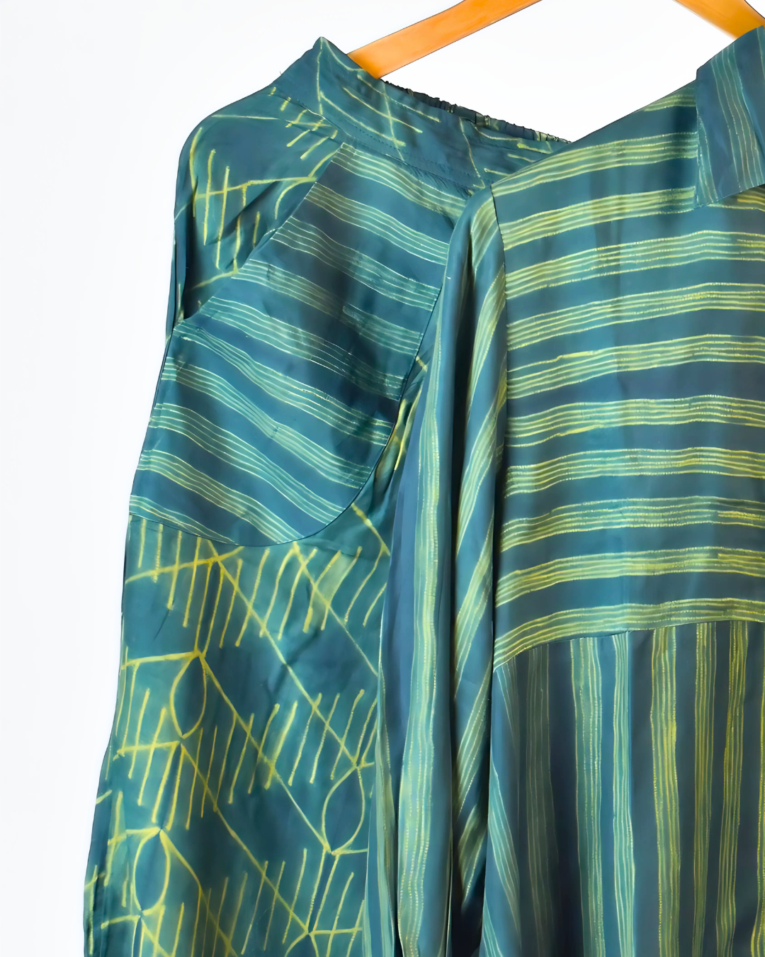 Crafted in plant-based silk and cupro cotton, this soft-textured co-ord set pairs a striped front-open shirt with uniquely designed loose pants. A blend of comfort, elegance, and modern style.